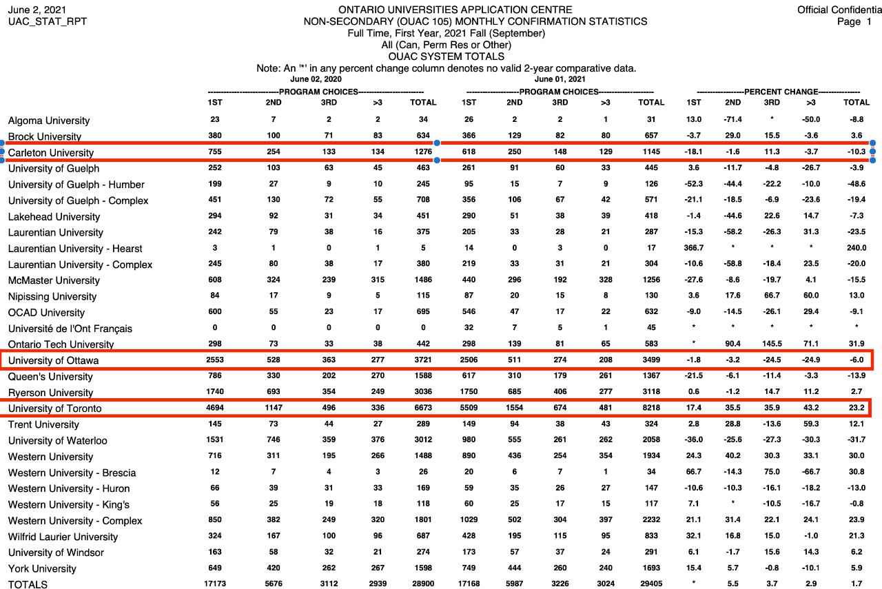 本地学生方面,渥太华两所大学的招生数量相较去年都有小幅度提升,在2.5%左右。