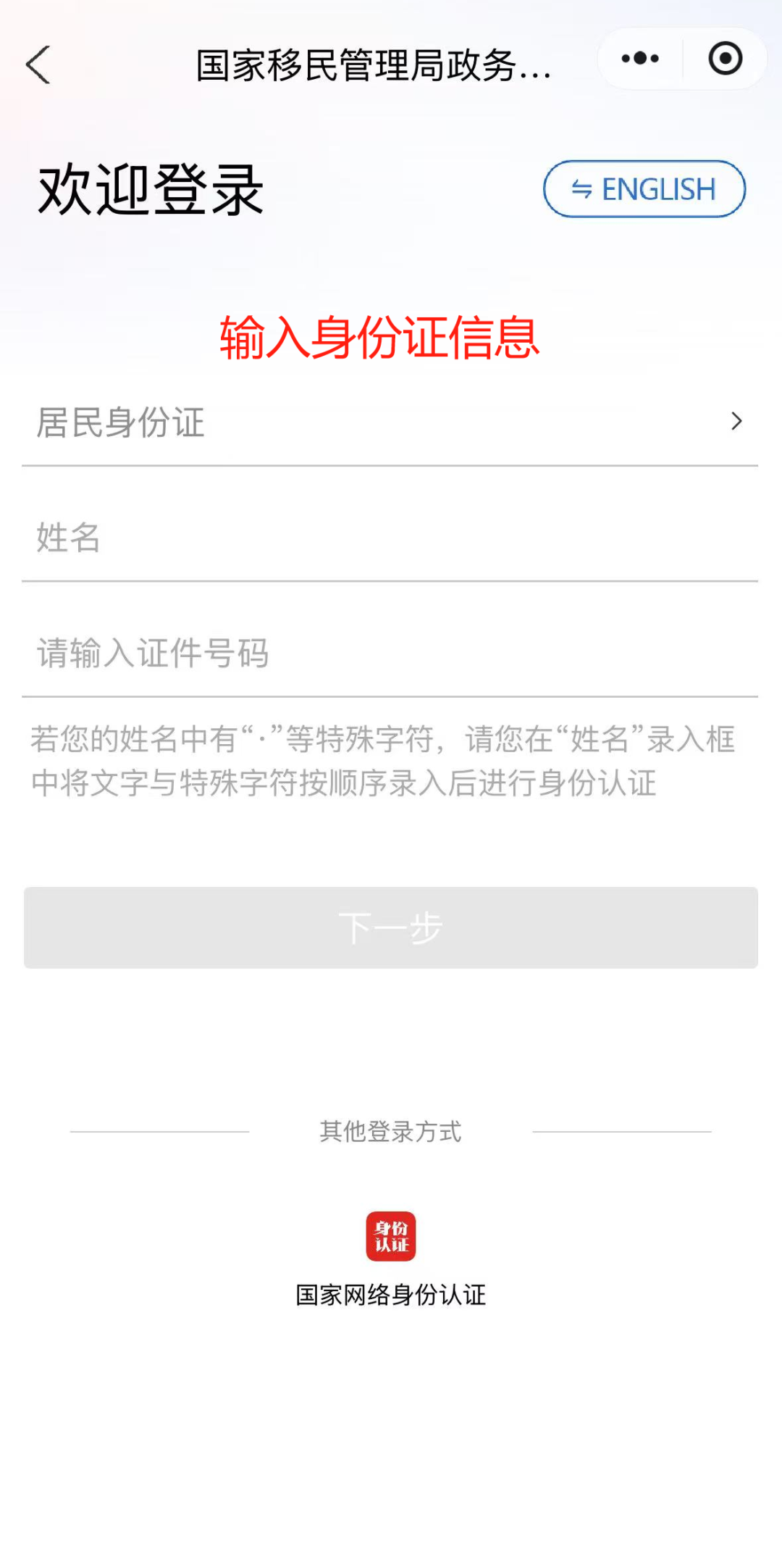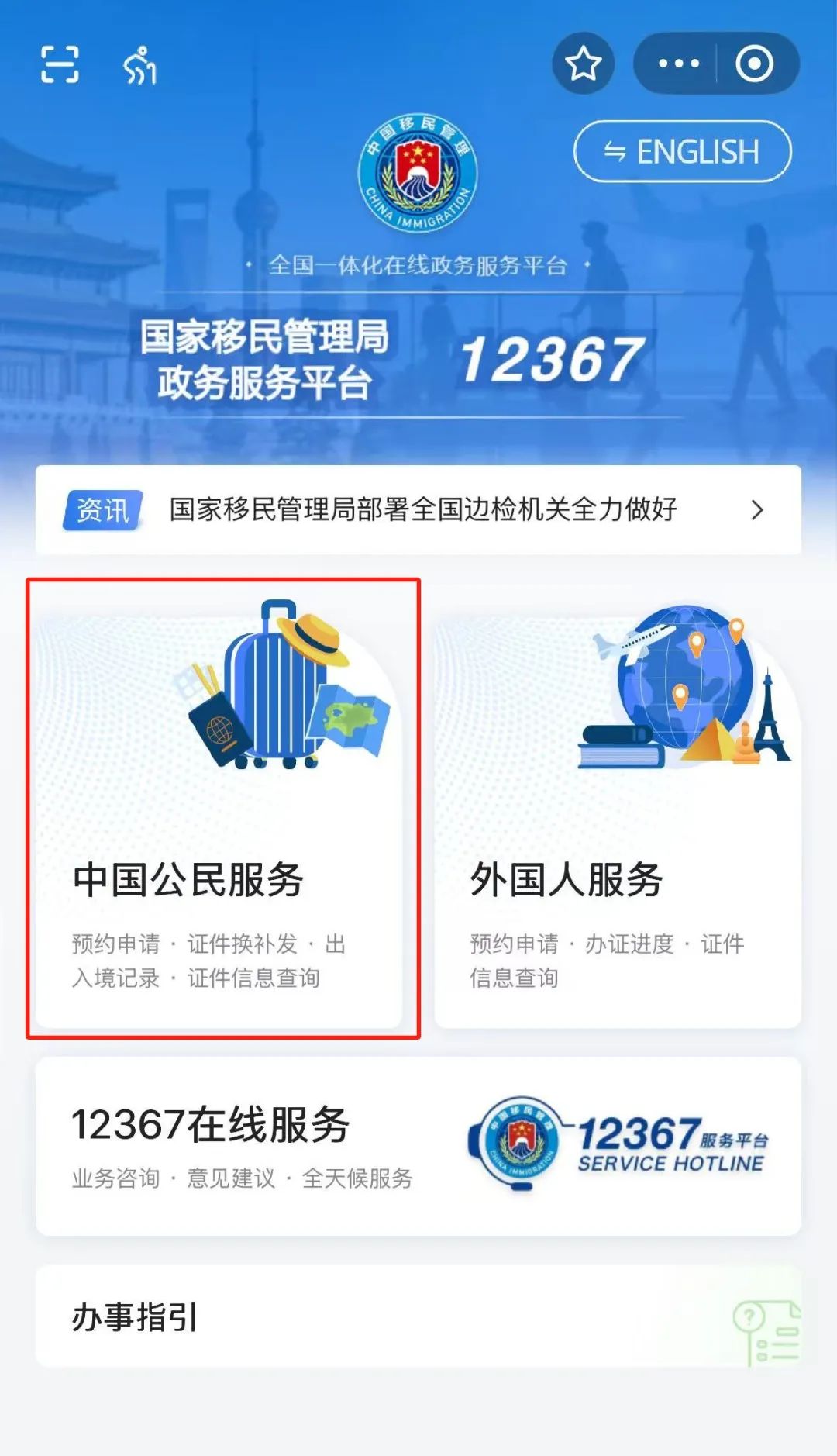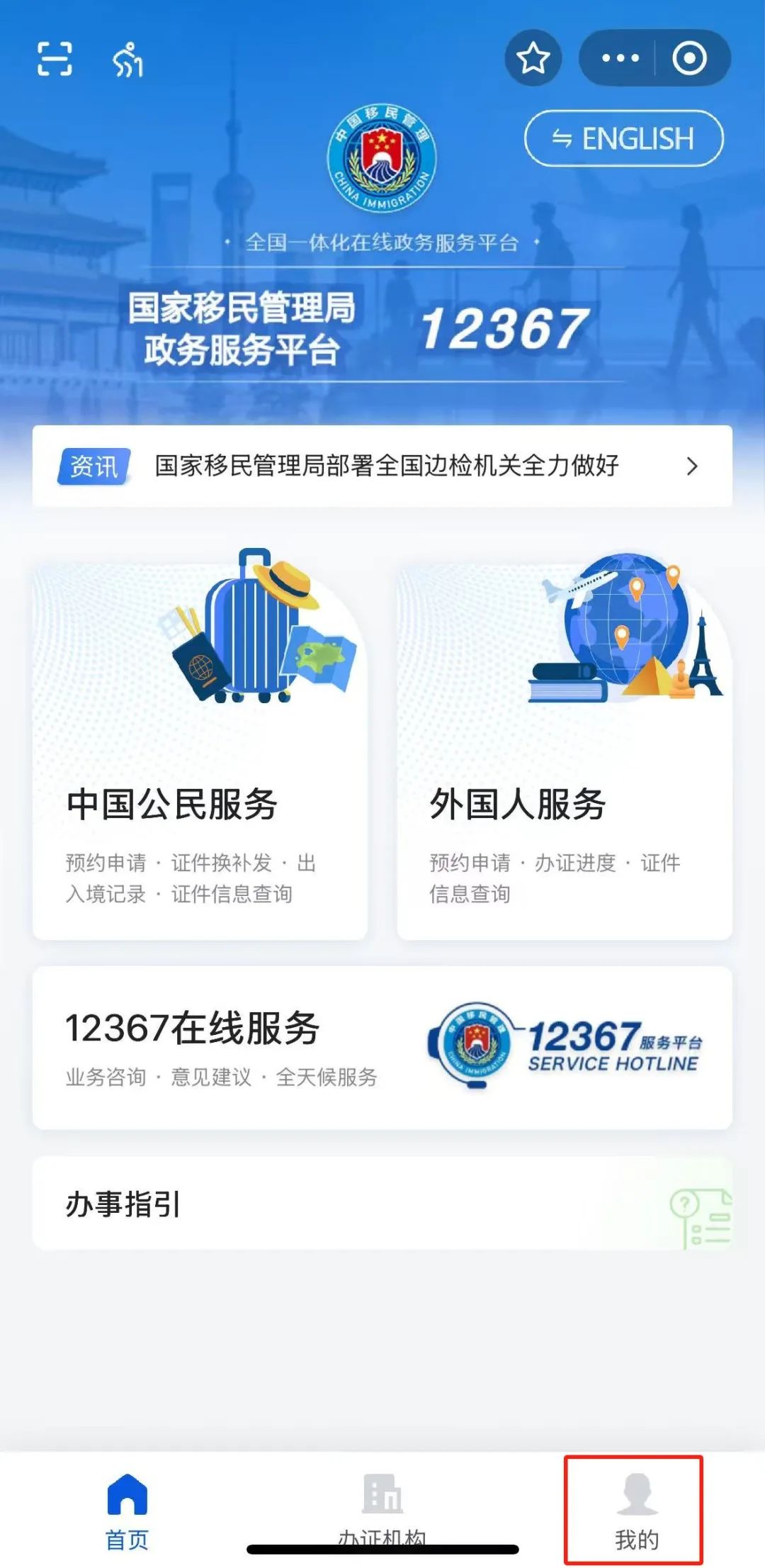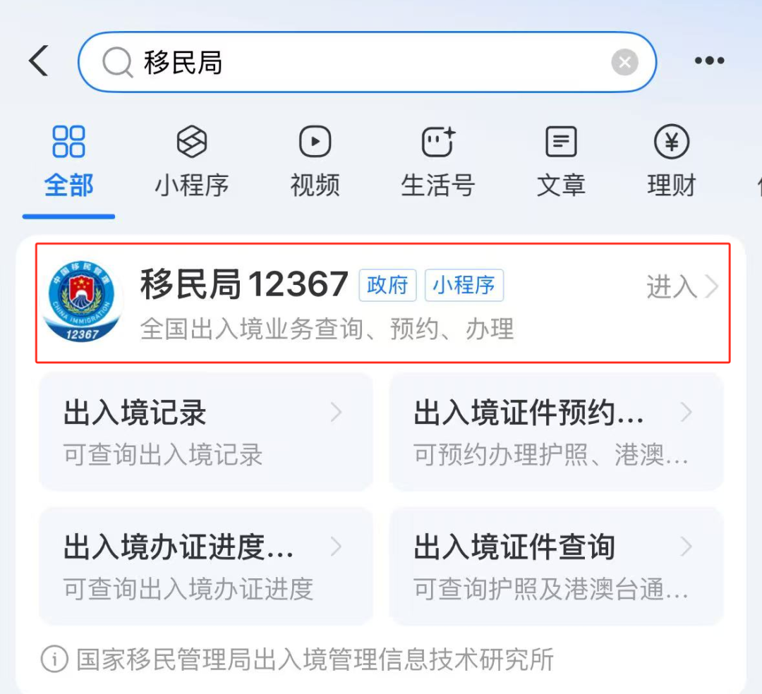 在微信/支付宝搜索栏输入“移民局”点击搜索,找到“移民局12367”小程序。